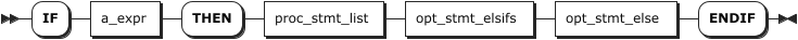 proc_if_stmt | IF 条件语句,用于根据给定的条件执行不同的 SQL 语句块,格式为 IF a_expr THEN proc_stmt_list opt_stmt_elsifs opt_stmt_else ENDIF。- a_expr:IF 语句的条件表达式,该表达式必须是返回布尔值的表达式。- proc_stmt_list:满足条件后需要执行的语句。支持的语句与 CREATE PROCEDURE 语句支持的语句相同。 - opt_stmt_elsifs:可选项,IF 语句的其他条件分支。 - opt_stmt_else:可选项,IF 语句的 ELSE 条件分支。说明 proc_if_stmt 语句仅在存储过程中使用。 |