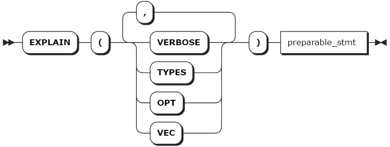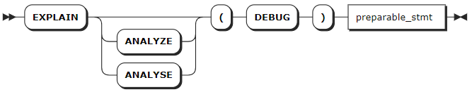 preparable_stmt | 需要进行 EXPLAIN 操作的语句。基本上,所有语句都可以和 EXPLAIN 组合使用,例如 CREATE、INSERT、UPDATE、DELETE 等。 |