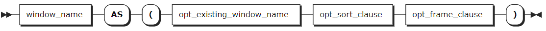 WINDOW window_definition_list | 由 window_definition 组成的窗口定义列表,支持的参数:- window_name:新窗口框架的名称。- opt_existing_window_name:现有窗口框架的可选名称,在不同的窗口定义中定义。- opt_sort_clause:可选 ORDER BY 子句。- opt_frame_clause:可选的框架子句,包含框架边界和/或 EXCLUDE 子句。 |