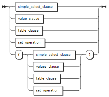 SELECT 子句 | SELECT 子句支持以下任一形式:- simple_SELECT_clause:简单 SELECT 子句。- values_clause:VALUES 子句。- table_clause:表子句。- set_operation:集合操作。 |