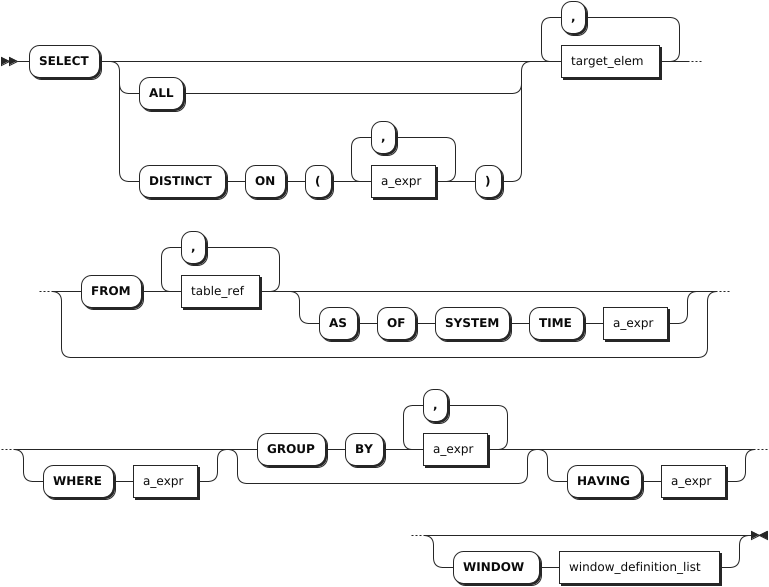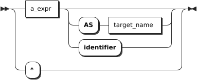 target_elem | 可以是标量表达式,也可以是星号(*)。当其为标量表达式时,用来计算每个结果行中的一列。当其为星号(*)时,自动从 FROM 子句中检索所有列。如果 target_elem 包含聚合函数,则可以使用 GROUP BY 子句进一步控制聚合。 |