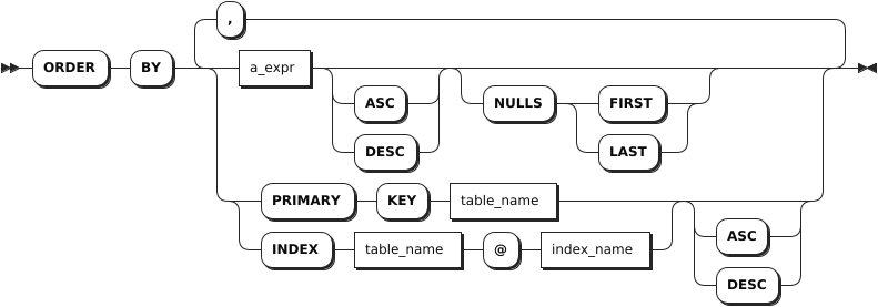 ORDER BY | ORDER BY 子句由若干个 ORDER 规范列表(可选,使用逗号(,)隔开)和 ASC/DESC 关键字(可选)组成。ORDER 规范支持以下任一形式:- a_expr:任意标量表达式,使用计算该表达式的结果作为排序键。- PRIMARY KEY + table_name:表的主键,使用给定表的主键作为排序键。该表必须是数据源的一部分。- INDEX + table_name + @ + index_name:表示法索引 @,使用给定表的索引的索引列作为排序键。该表必须是数据源的一部分。- 可选的关键字 ASC 和 DESC:用来指定排列的顺序,默认值为 ASC。当关键字为 ASC 时,按照排序键的升序(从小到大)来排列。当关键字为 DESC 时,按照排序键的降序(从大到小)来排列。 |