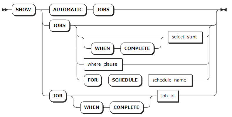 WHEN COMPLETE | 任务达到终止状态后再执行 SHOW JOBS 或 SHOW JOB 语句。 |
