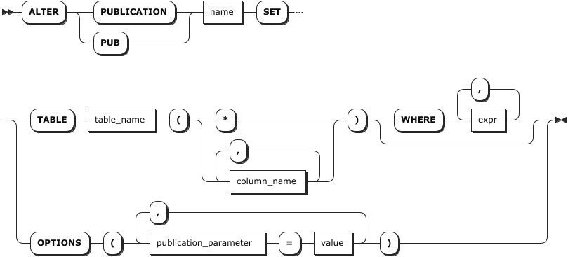 ALTER PUBLICATION 语句用于修改发布,包括 ALTER PUBLICATION SET TABLE 和 ALTER PUBLICATION SET OPTIONS 两个子命令: