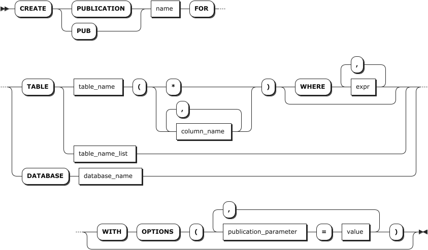 CREATE PUBLICATION 语句用于向当前数据库添加一个新的发布。发布的名称必须与当前数据库中任何现有发布的名称不同。